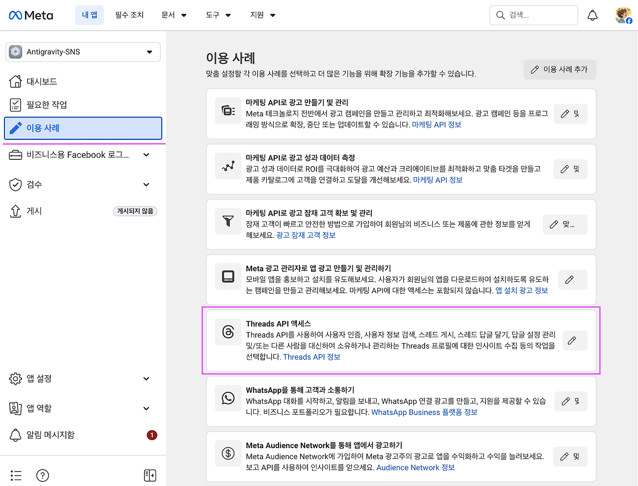 STEP 1. Meta 앱에 Threads API 이용 사례 추가