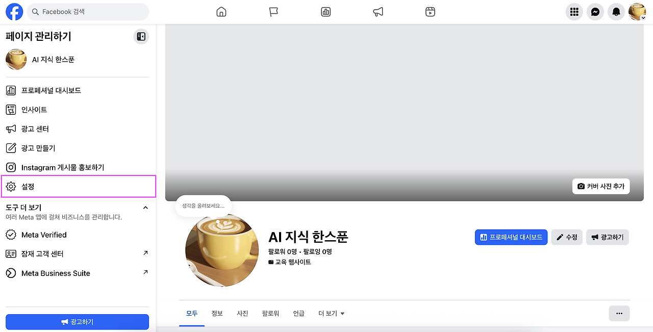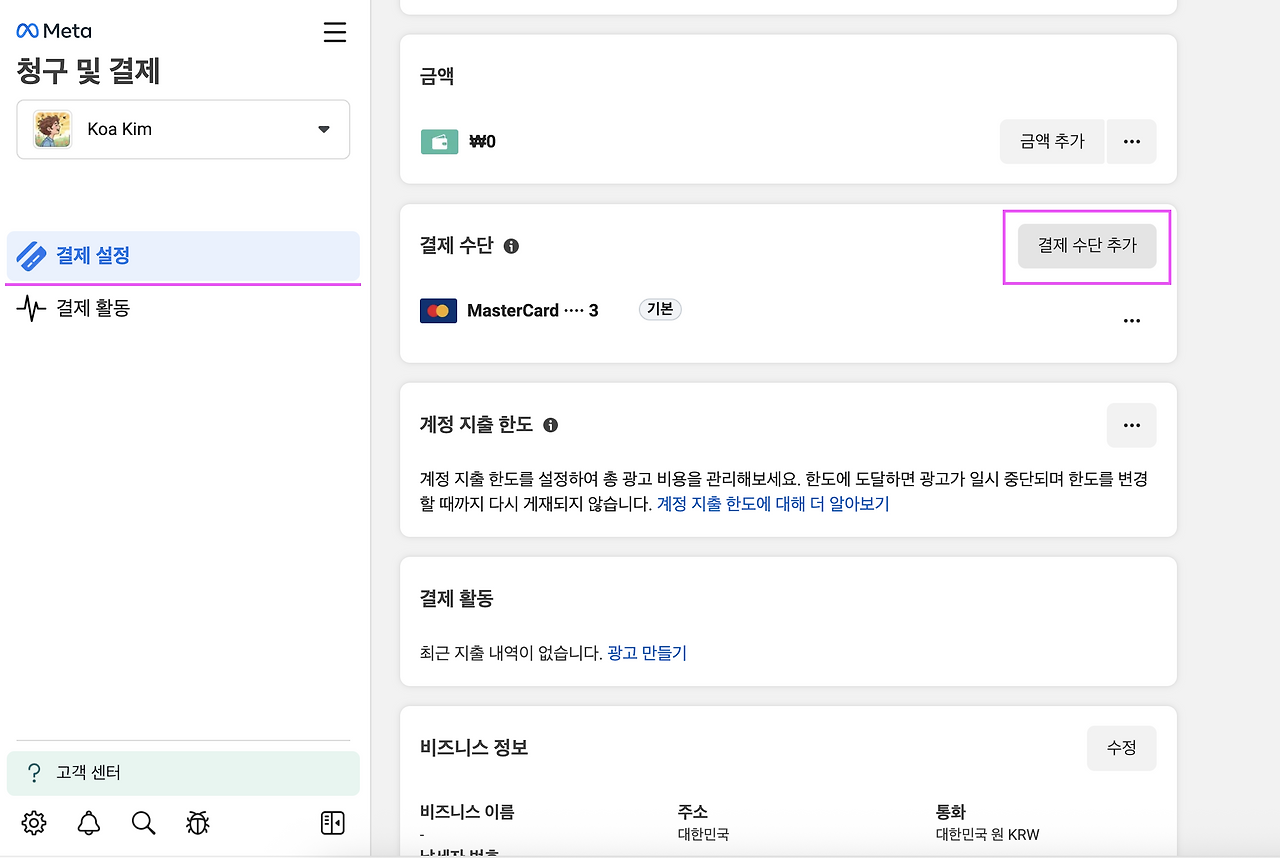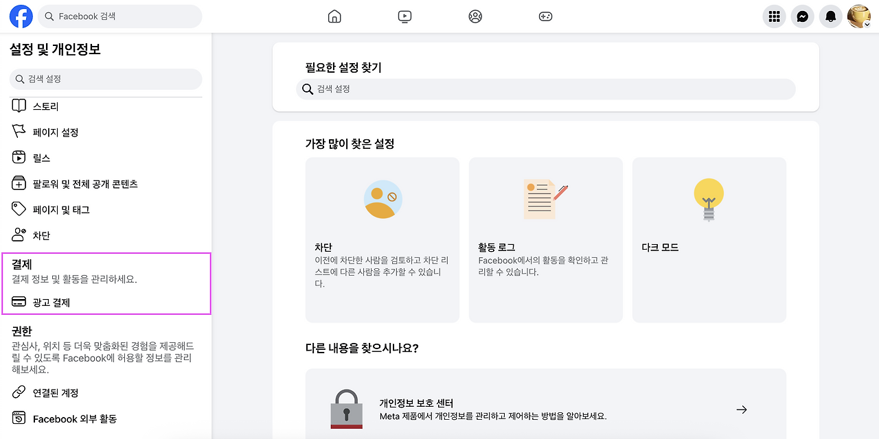 선택한 페이지의 상단에서 ‘설정’ 버튼을 클릭하고, ‘설정 및 개인정보 → 결제 → 광고 결제’ 메뉴로 이동합니다.