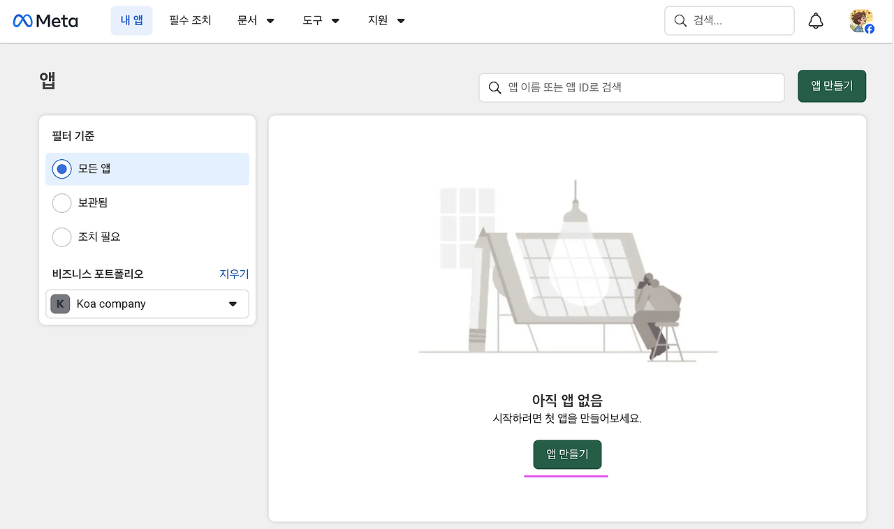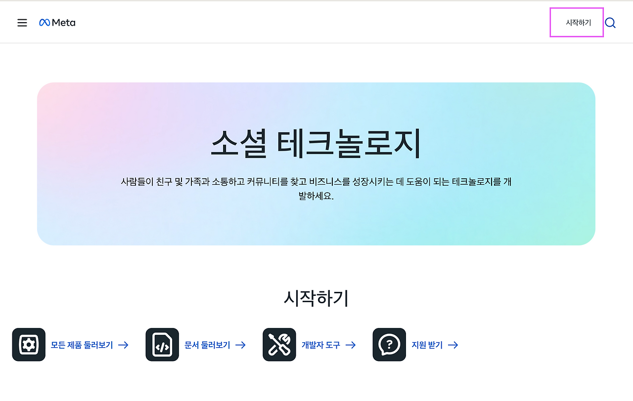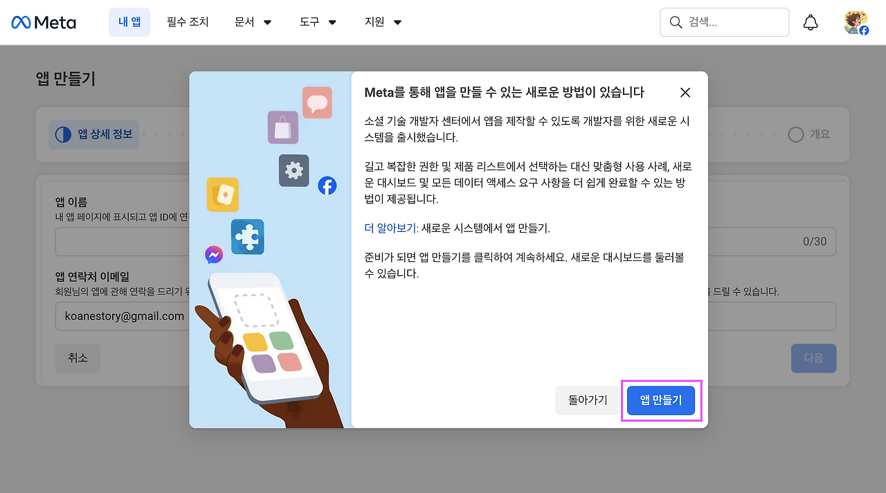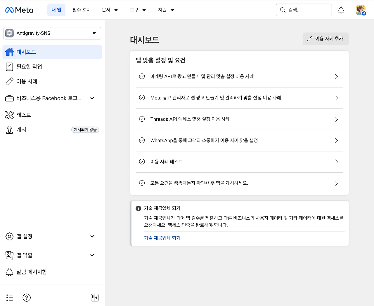 이제 Facebook과 Antigravity를 연결해 줄 Meta 개발자 앱을 만들어 보겠습니다.