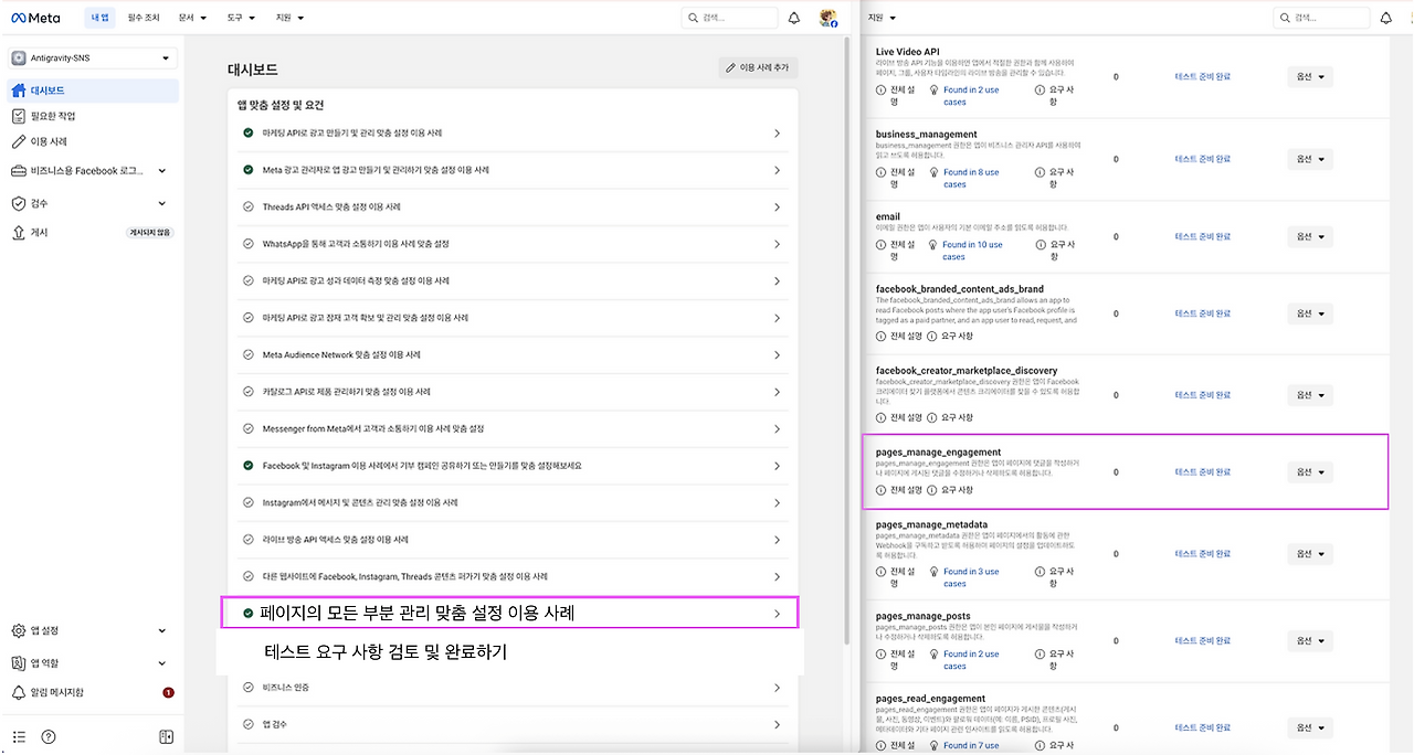 'Facebook 페이지'에 게시물을 올리고 관리하기 위해 "페이지의 모든 부분 관리 맞춤 설정 이용 사례"에서 pages_manage_posts, pages_read_engagement 권한을 허용하시기 바랍니다.
