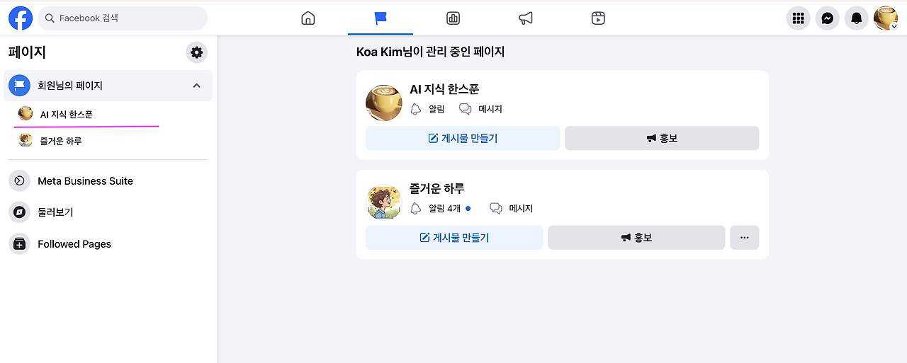 - 페이지가 없다면: Facebook 접속 → 좌측 메뉴 페이지 → 새 페이지 만들기