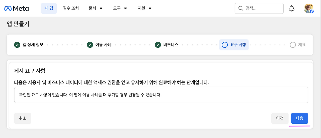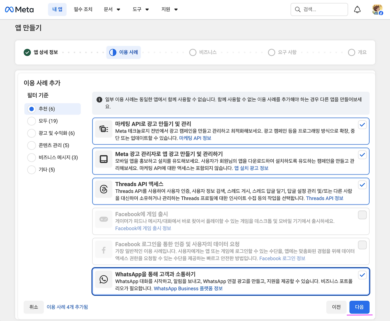 Meta 개발자 사이트에서 해당 앱의 「이용 사례」 메뉴로 이동합니다.