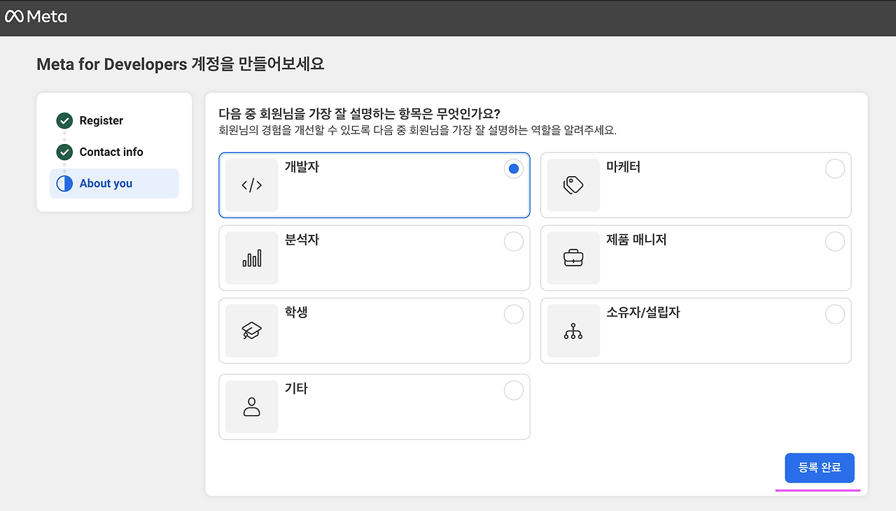 이후 ‘다음 중 회원님을 가장 잘 설명하는 항목은 무엇인가요?’ 단계에서 본인 업무와 가장 가까운 업종을 선택하고 ‘등록 완료’를 클릭합니다.