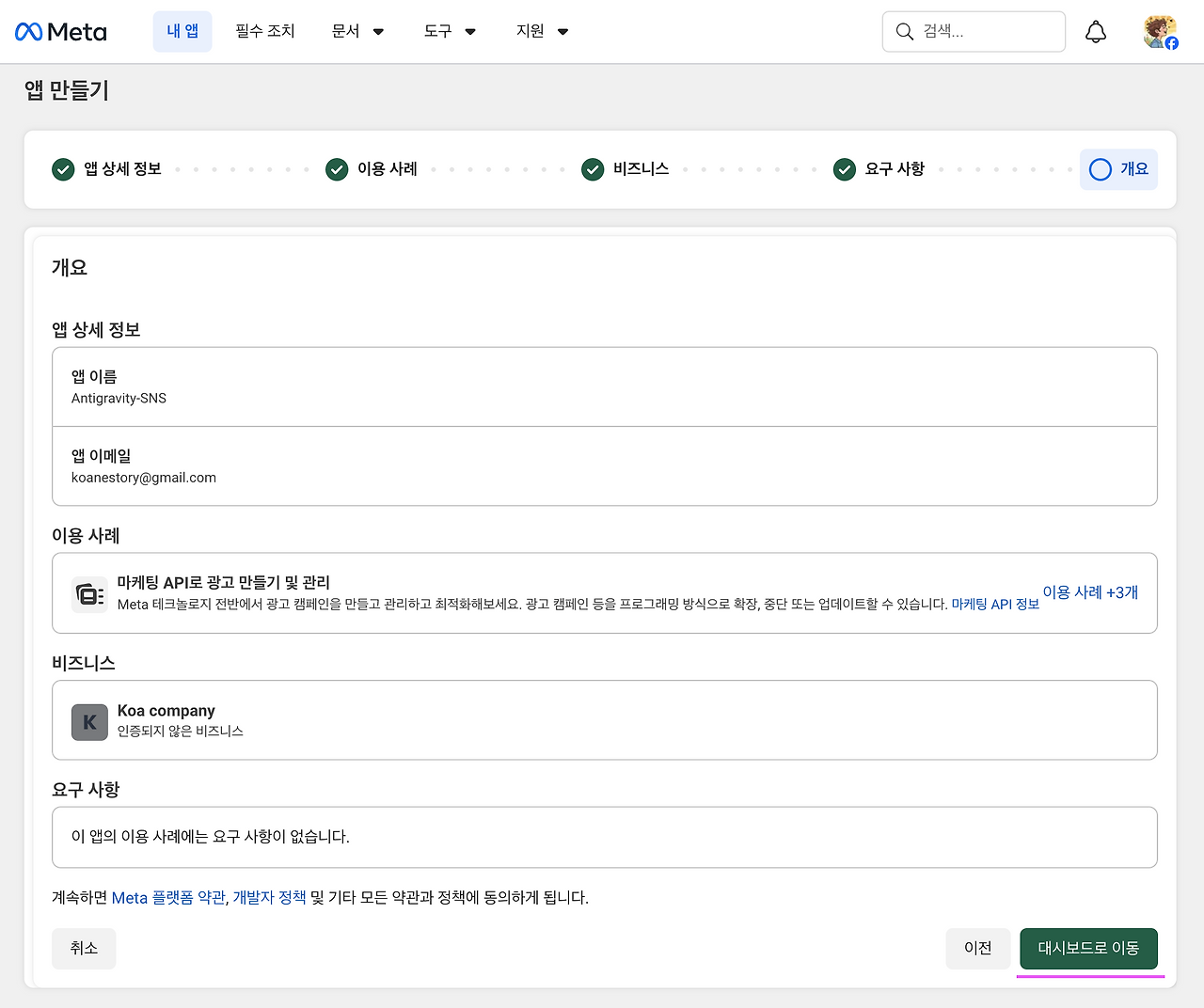 모든 단계를 마치면 ‘대시보드로 이동’ 버튼이 보이고, 이를 클릭하면 앱 대시보드 화면으로 진입하게 됩니다.
