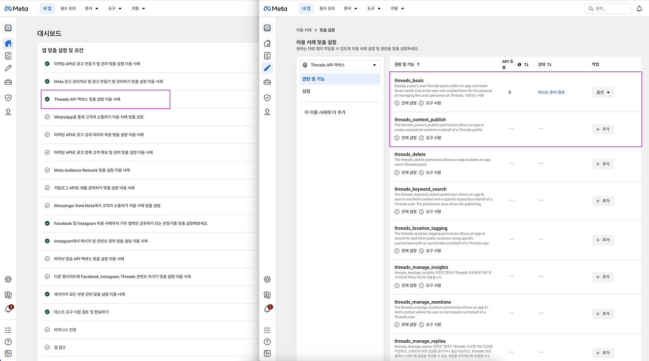 주요 권한(Permission): threads_basic, threads_content_publish 권한을 추가해야 합니다.