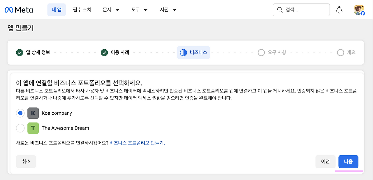 연결할 비즈니스 포트폴리오를 선택한 뒤, ‘앱 만들기’ 버튼을 클릭합니다.