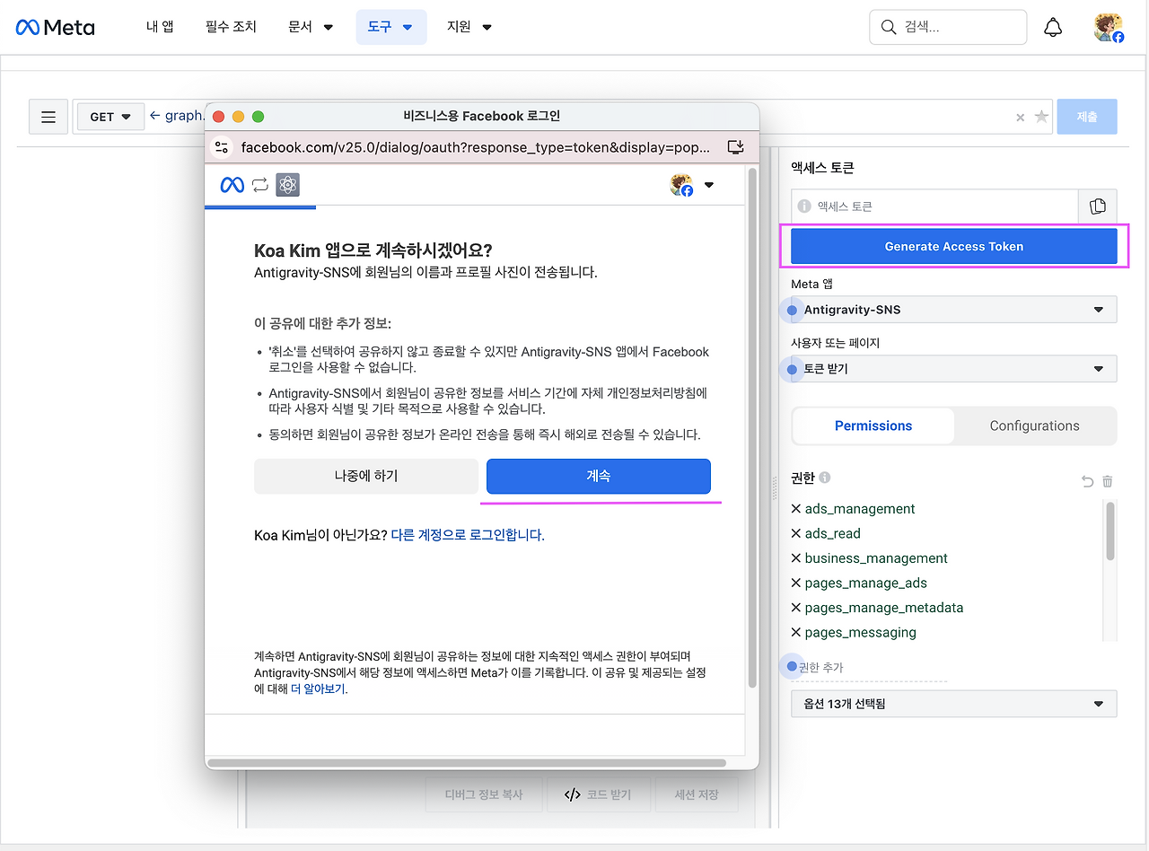 페북, 인스타, 스레드 인증키 발급 후 Antigravity에 연결하기
