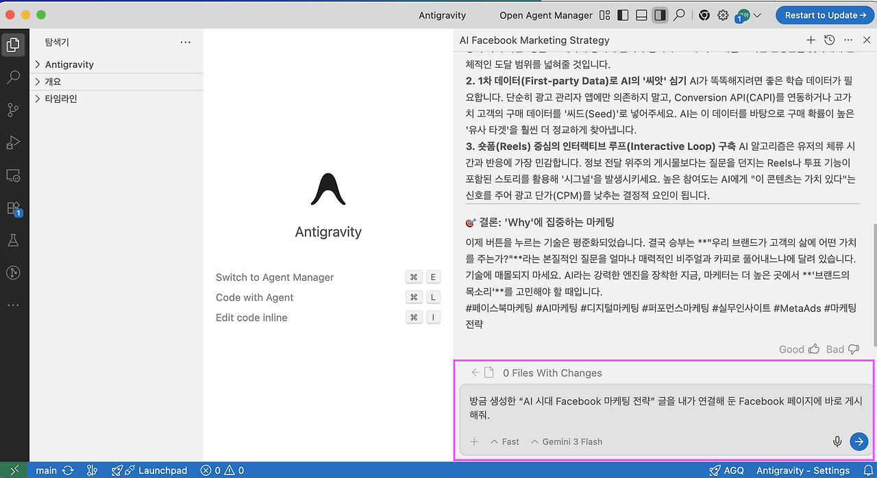 이제 준비된 글을 Antigravity에게 Facebook에 올리라고 지시하는 단계입니다.