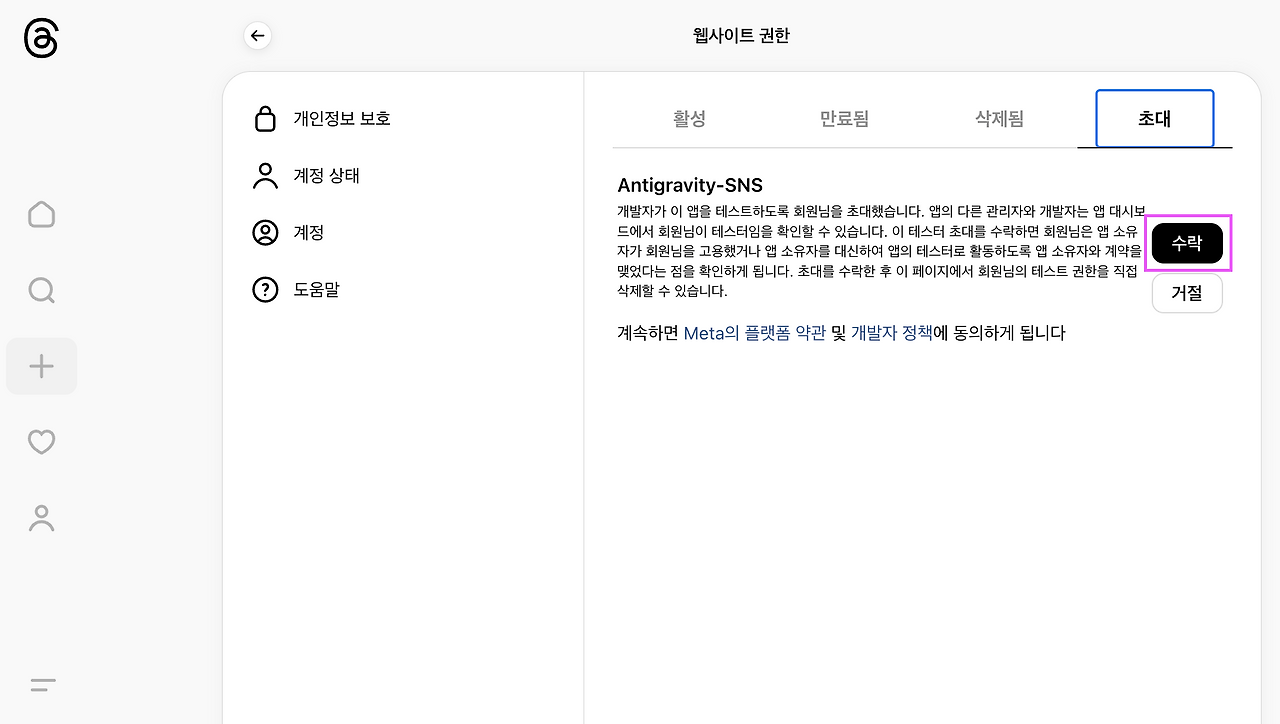 [초대] 탭에서 방금 추가한 앱(예: Antigravity-SNS)을 선택하고 [수락]을 누르면, Threads에서도 자동 발행에 필요한 준비가 완료됩니다.