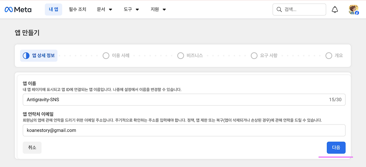 앱 이름과 앱 연락처 이메일을 입력하고 ‘다음’을 클릭합니다.