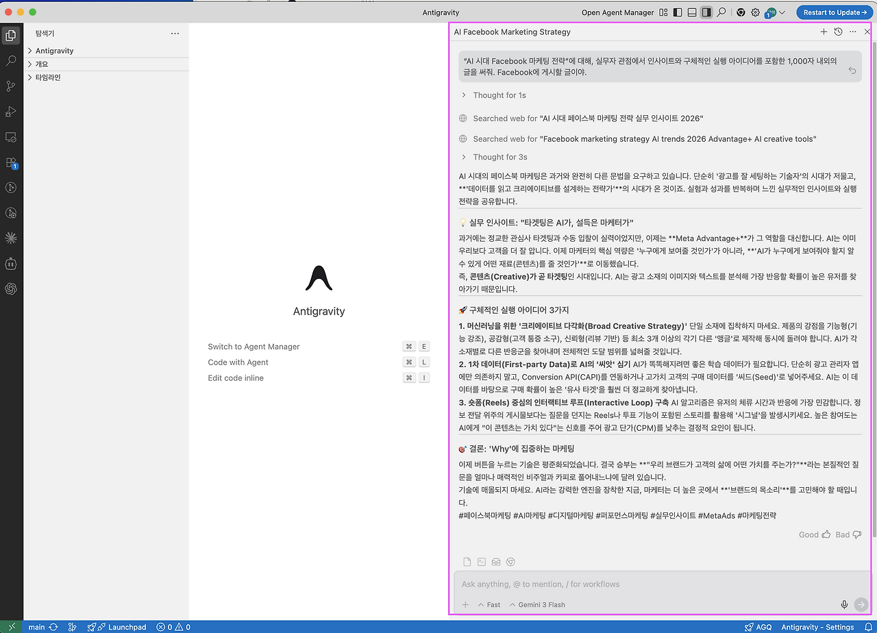 이 과정까지 마치면, “Facebook에 올릴 준비가 된 글 한 편”이 Antigravity 안에 만들어진 상태가 됩니다.