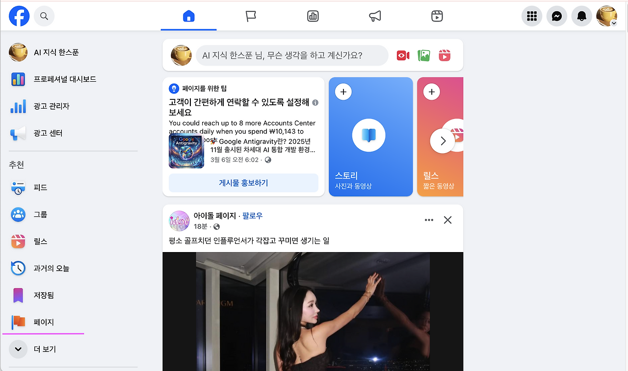 [보내기]를 누르면 Antigravity가 Facebook API를 통해 해당 페이지에 글을 발행합니다.