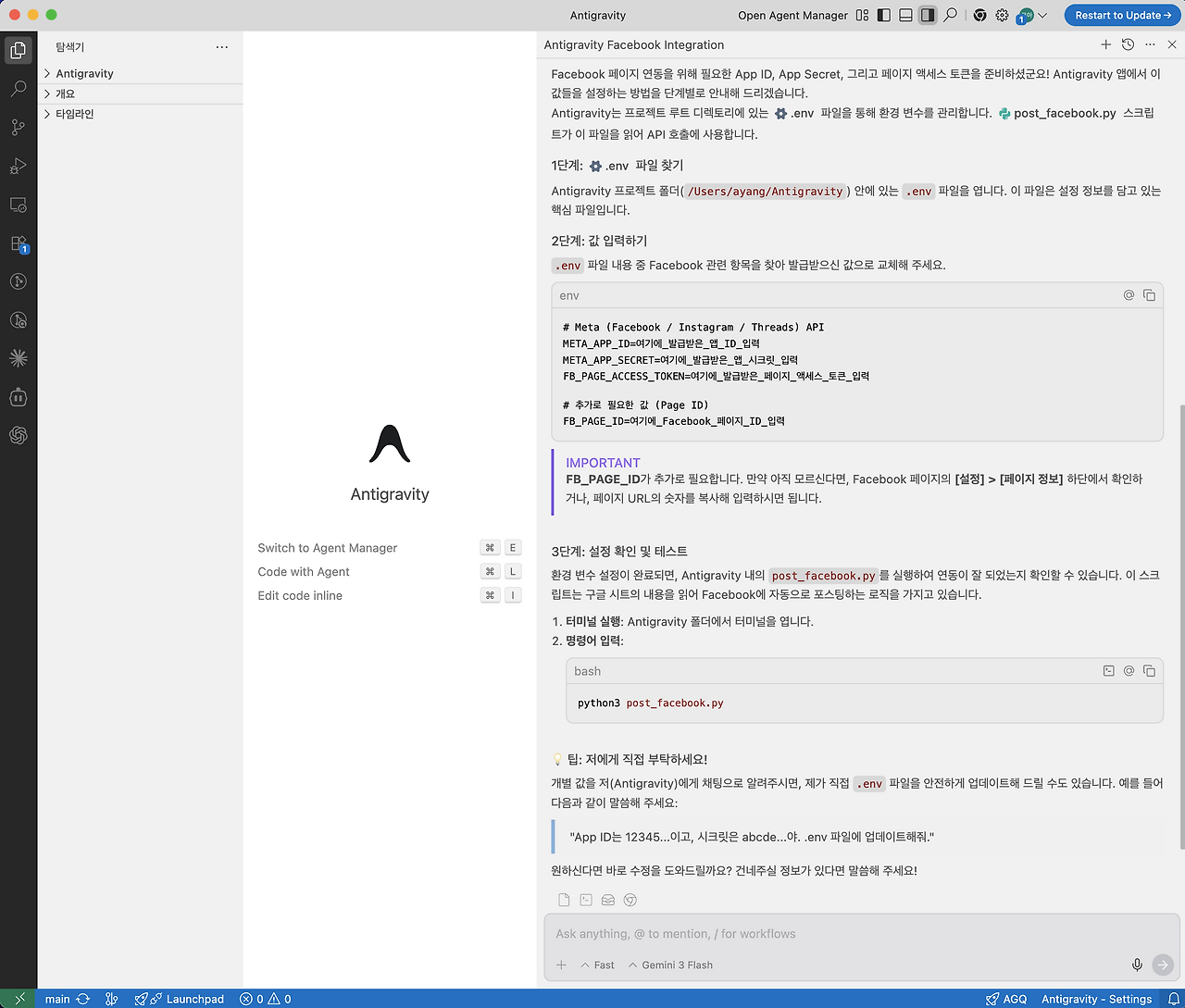 콘텐츠를 만들기 전에, 먼저 Antigravity에게 “이제 Facebook과 연결을 시작하겠다”는 의도를 분명하게 알려 주는 것이 좋습니다. 이미 Facebook 개발자 센터에서 앱 ID, 앱 시크릿 코드, Facebook 페이지 접근을 위한 액세스 토큰까지 발급받았다면, 이제 남은 것은 이 정보를 바탕으로 어떻게 연동을 진행할지 Antigravity에게 자연어로 물어보는 일입니다.