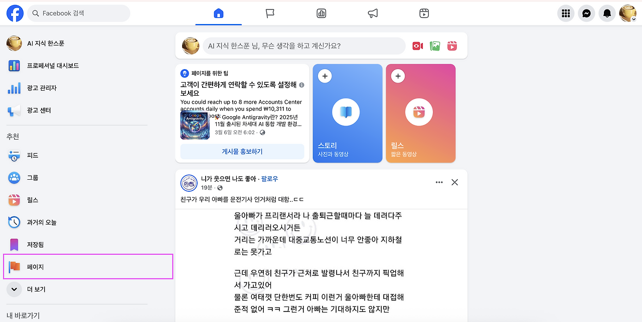페이스북에서 왼쪽 메뉴의 [페이지]를 클릭한 뒤, 결제 정보를 등록 할 Facebook 페이지를 하나 선택합니다.