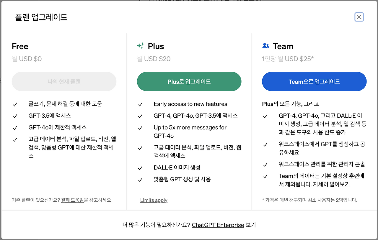 유료 버전인 ChatGPT Plus는 ChatGPT-4 모델을 사용하고 확장된 기능 및 더 많은 API 와 플러그인을 사용 할 수 있습니다. 또한, 더 빠른 응답 시간과 새로운 기능에 대한 우선 접근 권한을 포함하여, 복잡한 프로젝트를 수행할 수 있는 많은 데이터와 기능을 사용할 수 있습니다.