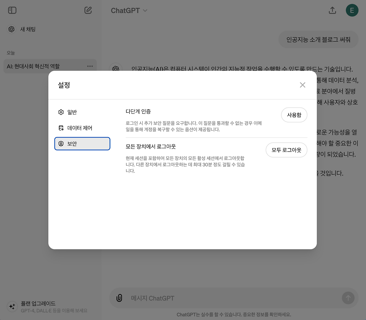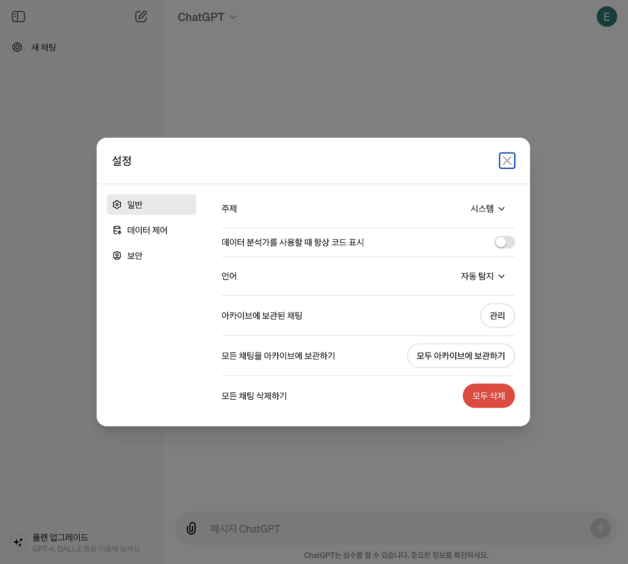 '설정' 클릭 시 '일반, 데이터 제어, 보안' 관련 설정을 할 수 있는 팝업이 뜹니다. '일반' 탭의 주제에서 다크모드, 라이트 모드를 선택할 수 있고 기본 적인 응답 언어와 채팅 기록 아카이브나 일괄 삭제도 할 수 있습니다.