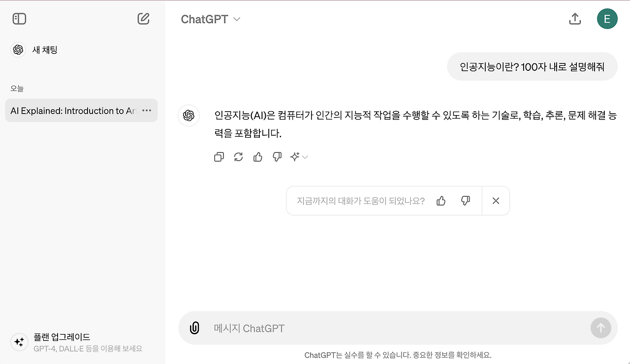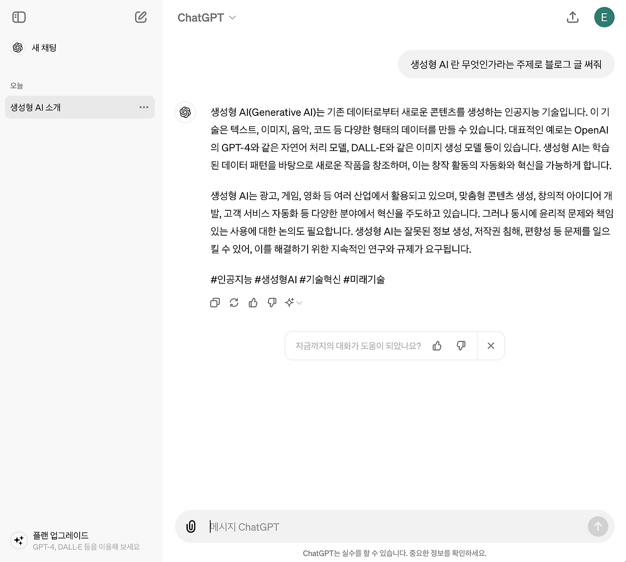 기본적으로 무료 버전이 제공되며 유료로 전환하려면 왼쪽 하단 '플랜 업그레이드'를 클릭하여 플랜 선택 후 결제하면 됩니다. 생성형 AI 에게 요청하는 질문이나 지시를 프롬르트라고 하며, 프롬프트 방법은 아래 글을 참고하시기 바랍니다.