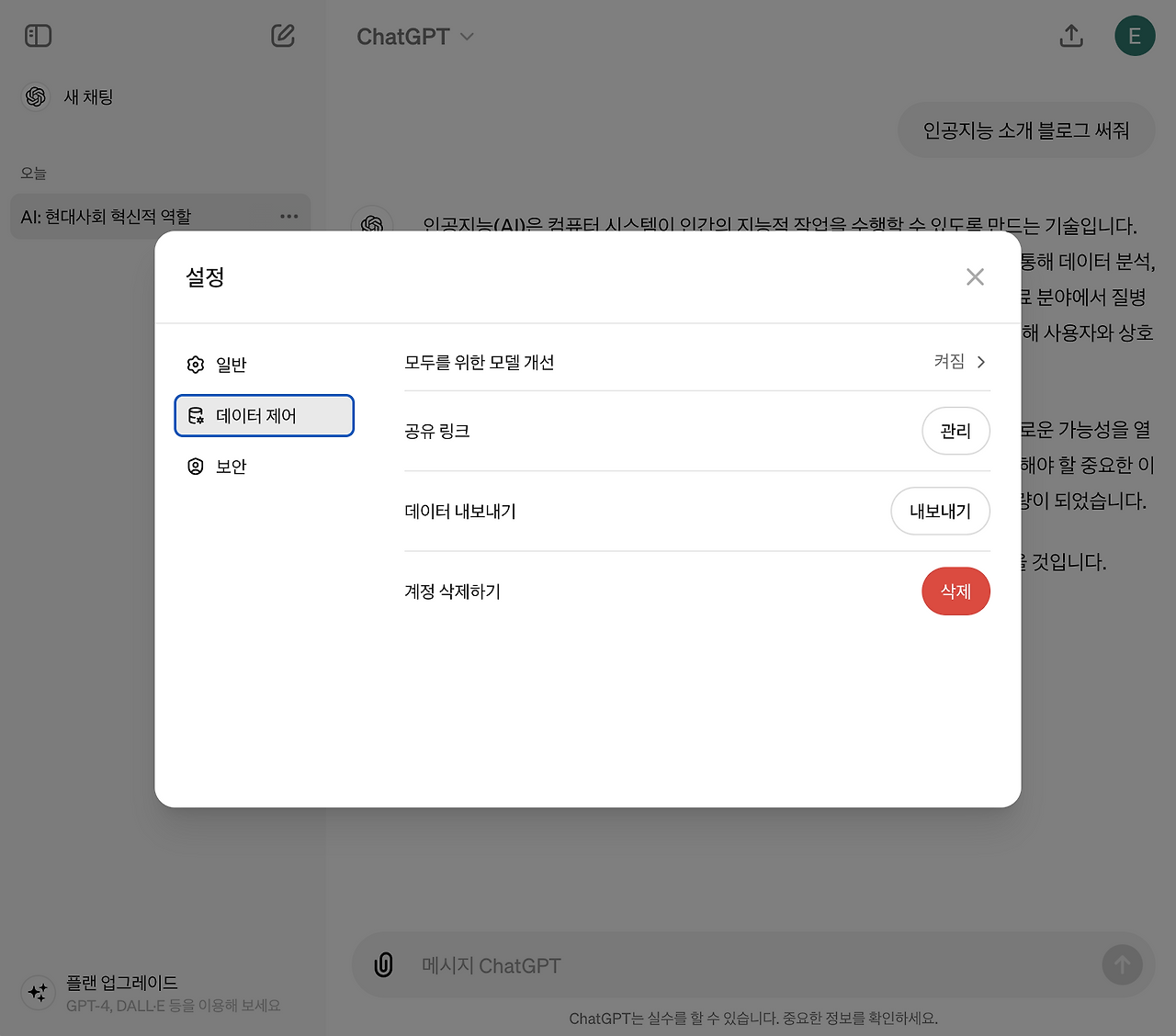 데이터 제어 : '모두를 위한 모델 개선'을 켜짐으로 선택하면 채팅 기록이 ChatGPT의 학습 데이터로 사용됩니다. 하여 개인 정보나 회사 정보와 같이 민감한 내용이 포함된 경우 반드시 꺼짐으로 선택하시기 바랍니다. '공유 링크'를 통해 콘텐츠 외부 공유 링크를 생성할 수 있으며 '데이터 내보내기'를 통해 콘텐츠를 메일로 받을 수 있습니다.