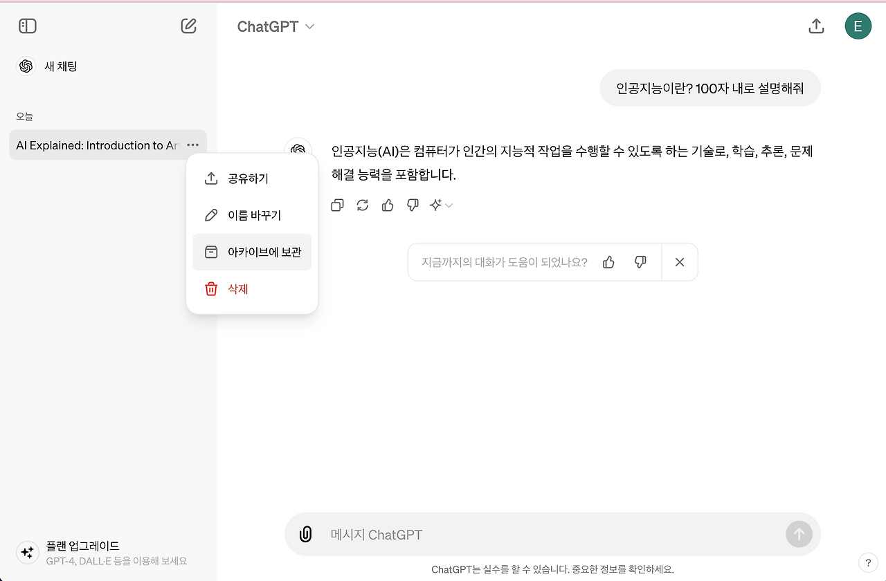 왼쪽 상단의 ‘새 채팅' 버튼을 클릭하여 채팅을 시작합니다. 질문/요청을 입력하고 Enter를 치면 답변을 확인 할 수 있으며 채팅 기록은 왼쪽 목록에 남습니다. 채팅 기록의 점(...)을 눌러서 해당 글을 '공유하기, 이름 바꾸기, 아카이브에 보관, 삭제' 할 수 있습니다.