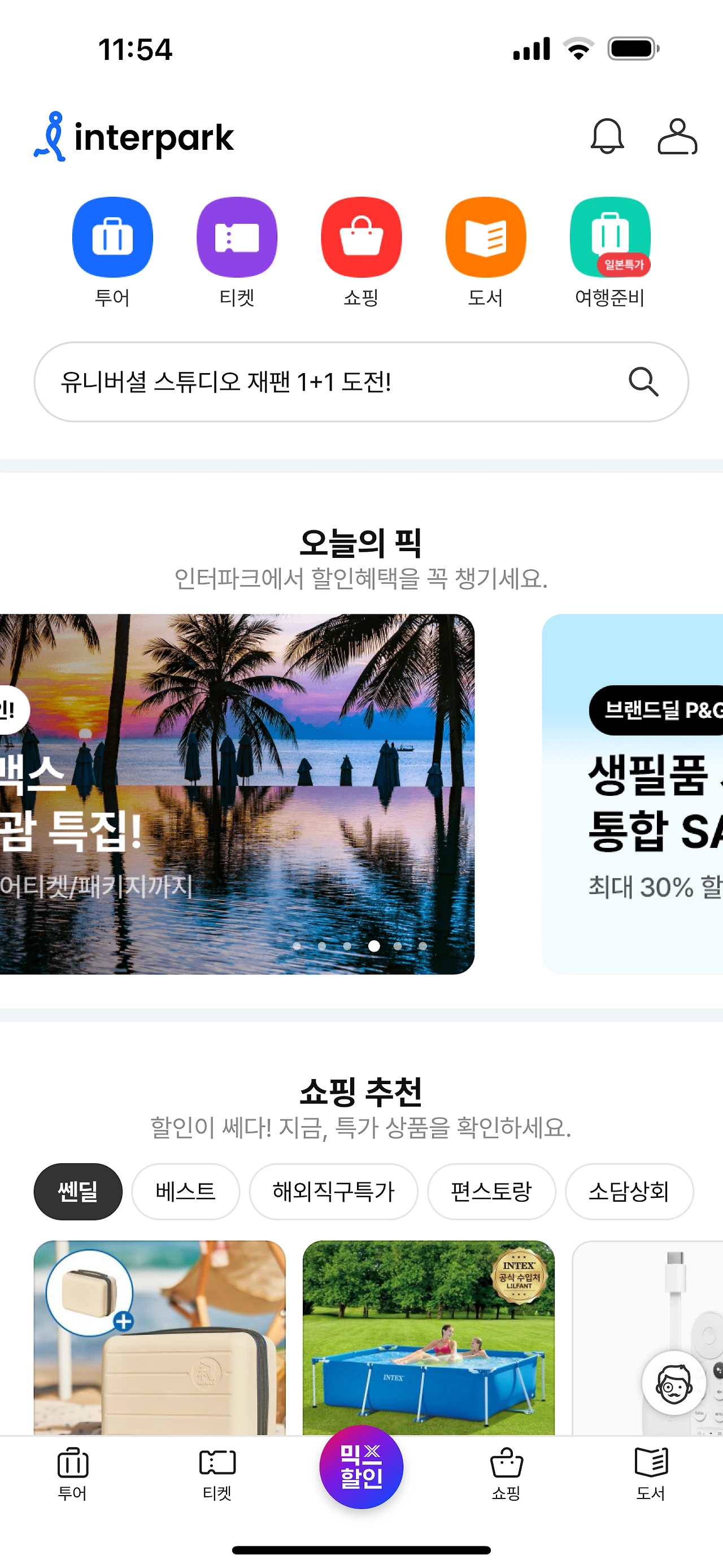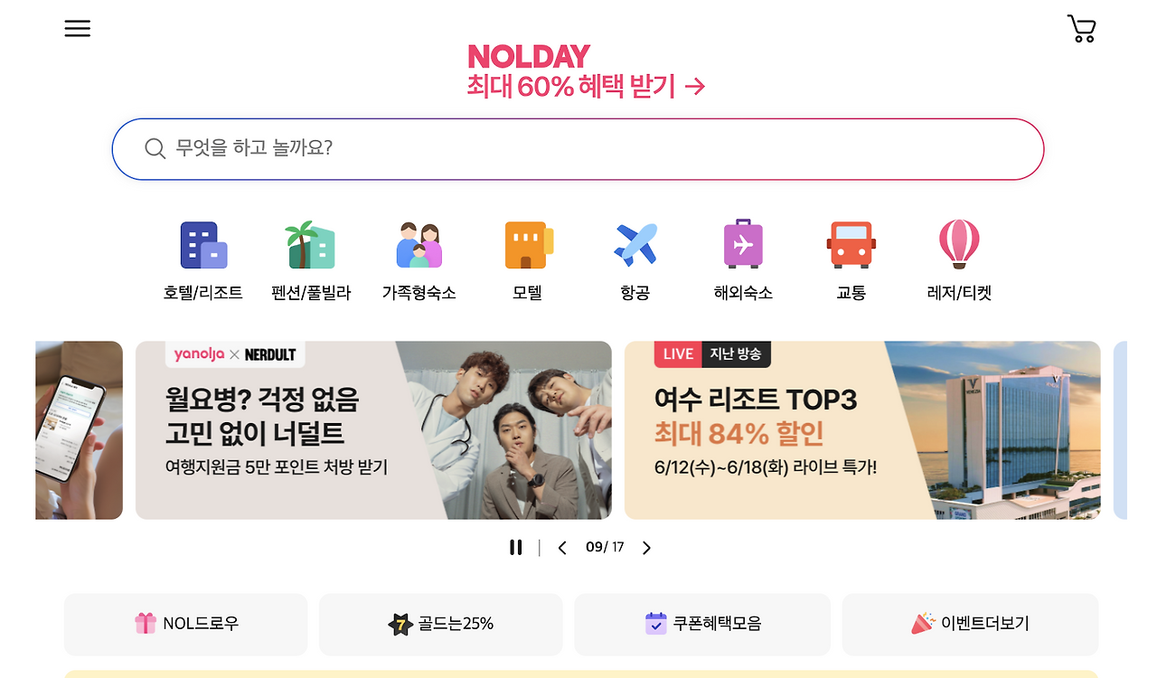 야놀자가 인수한 온라인 티켓 예매 및 쇼핑 서비스입니다. 인터파크를 통해 공연, 영화, 전시회 등의 티켓을 예매하고, 도서, 음반, e쿠폰 등을 구매할 수 있습니다.