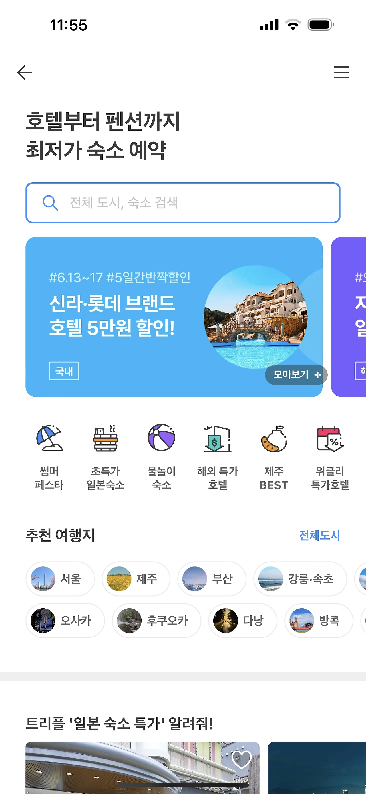 국내외 호텔, 리조트, 펜션, 풀빌라, 가족형 숙소, 모델 등 숙박 시설 뿐만 아니라 항공권, 교통, 레저, 티켓을 예약할 수 있습니다.