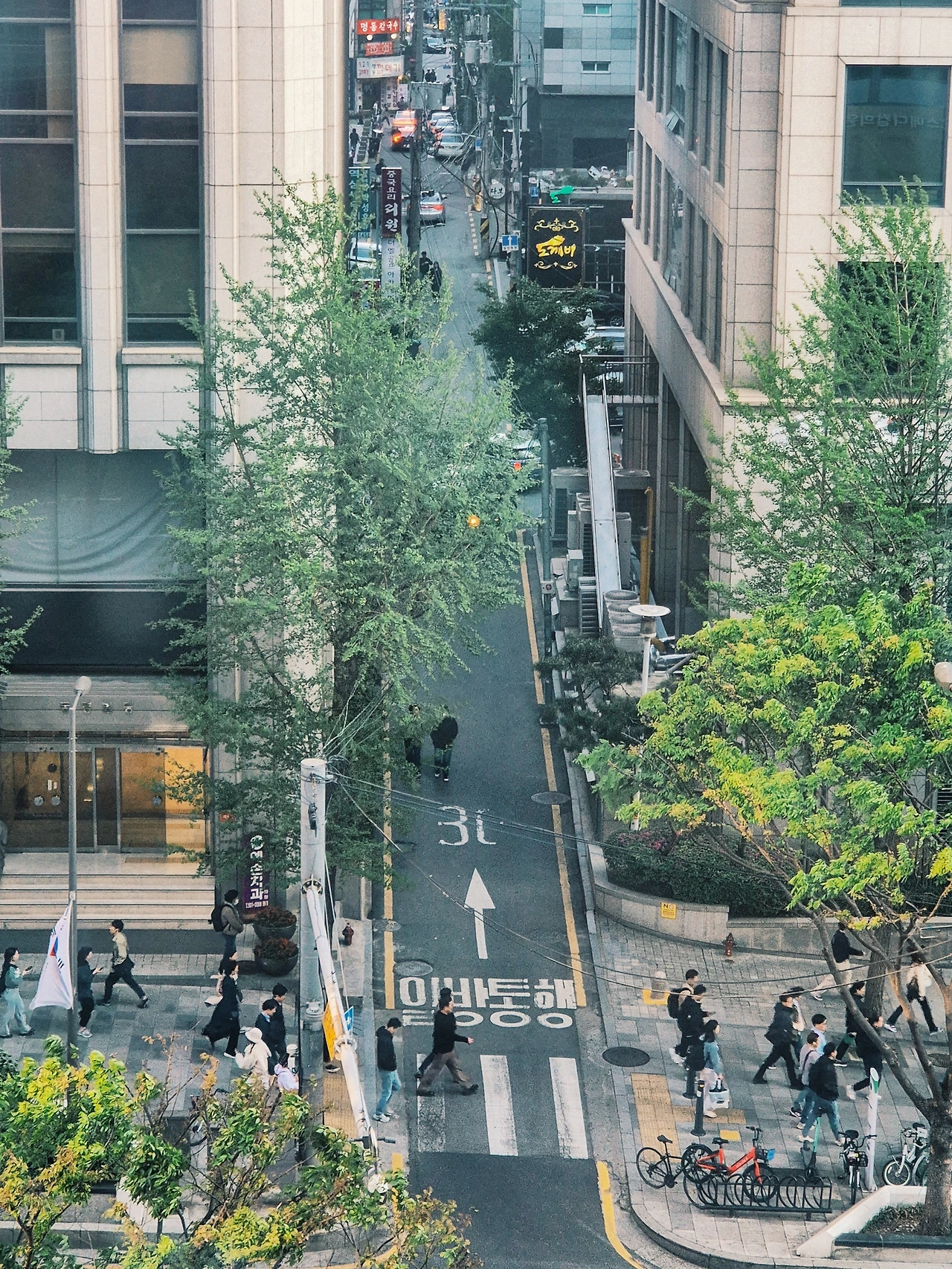 회사에서 창밖을 보다가, 사람들이 분주히 오가고 빽빽하게 들어선 건물들 사이로 '일방통행'이라는 흰 글씨가 눈에 들어왔다.