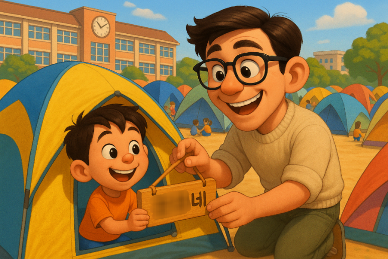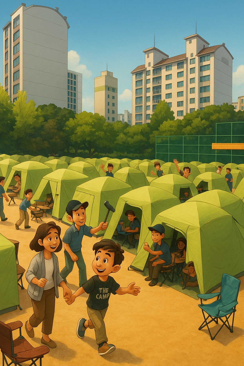 평소엔 아이들의 발소리와 휘슬 소리로 가득한 이곳에, 가지런히 초록 텐트들이 세워졌다. 마치 도심 속에 피어난 작은 마을 같았다.