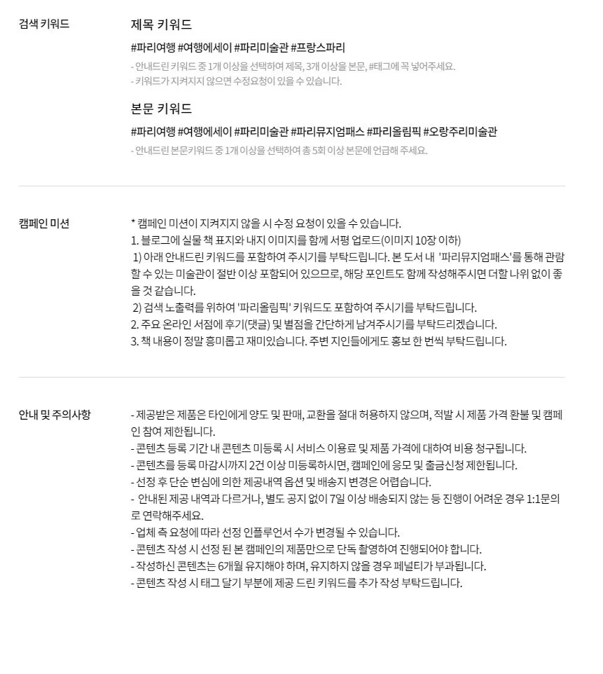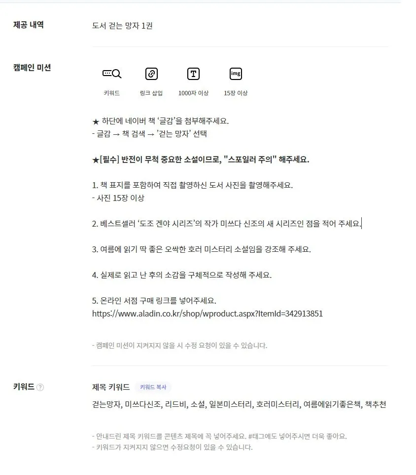 다시 말하지만, 꾸준하게 운영되고 있고, 방문자 유입이 이루어지고 있는지가 중요하다. 2. 운영 지침에 맞춰서 글을 잘 써왔는가 실제로 서평단 참여 시, 마감 기한을 포함해 여러 가이드라인이 있다. 하지만 생각보다 잘 지키지 않는 사람들도 많다. 하지만, 서평단 또한 서로 간의 약속이니만큼, 반드시 지켜야 한다.