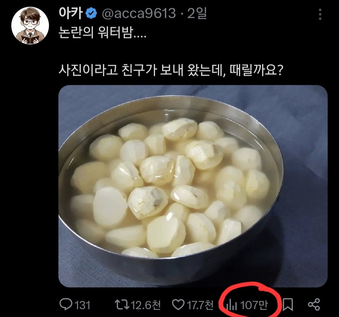 아래 사진은 필자가 X에서 단순 웃음 유발을 위해 올린 글이다. 감동이나 기억에 남을 만한 임팩트가 있는 글은 아니었다. 그런데도 107만 조회수를 기록했다.