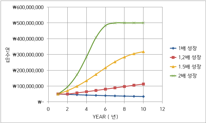 Case 2) 한계 연간 수입이 10억 원일 경우, 성장률 2배~4배일 경우