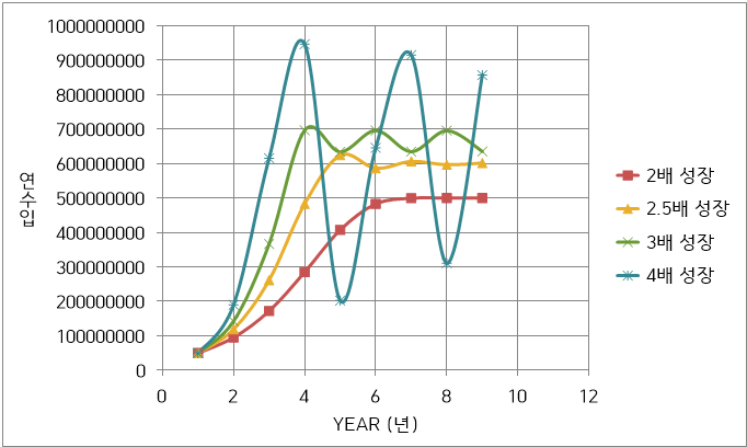 2.5배의 성장률과 3배의 성장률부터 연수입의 변동 (통계학적 표현으로는 감쇄 진동)이 나타나게 됩니다. 다시 말해 연수입이 일정 수준 감소하는 경향도 나타나게 되는 것입니다. 그래도 그리 크게 문제가 되지 않는 것은 연수입의 변동폭이 그리 크지 않고 일정 수준을 유지할 수 있다는 사실을 알 수 있습니다.