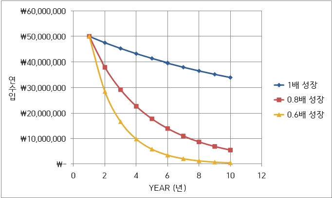 반대로 성장률이 1배 이하일 경우에는 어떻게 될까요? 여러분들이 예상하는 바대로 연수입이 줄어들 것입니다. 그래프는 다음과 같습니다. 하지만 성장률 4.5배일 때보다는 연수입이 계속 플러스라는 것을 알 수 있습니다. 그래도 0의 수준에 수렴하게 된다는 사실을 어렵지 않게 볼 수 있습니다.
