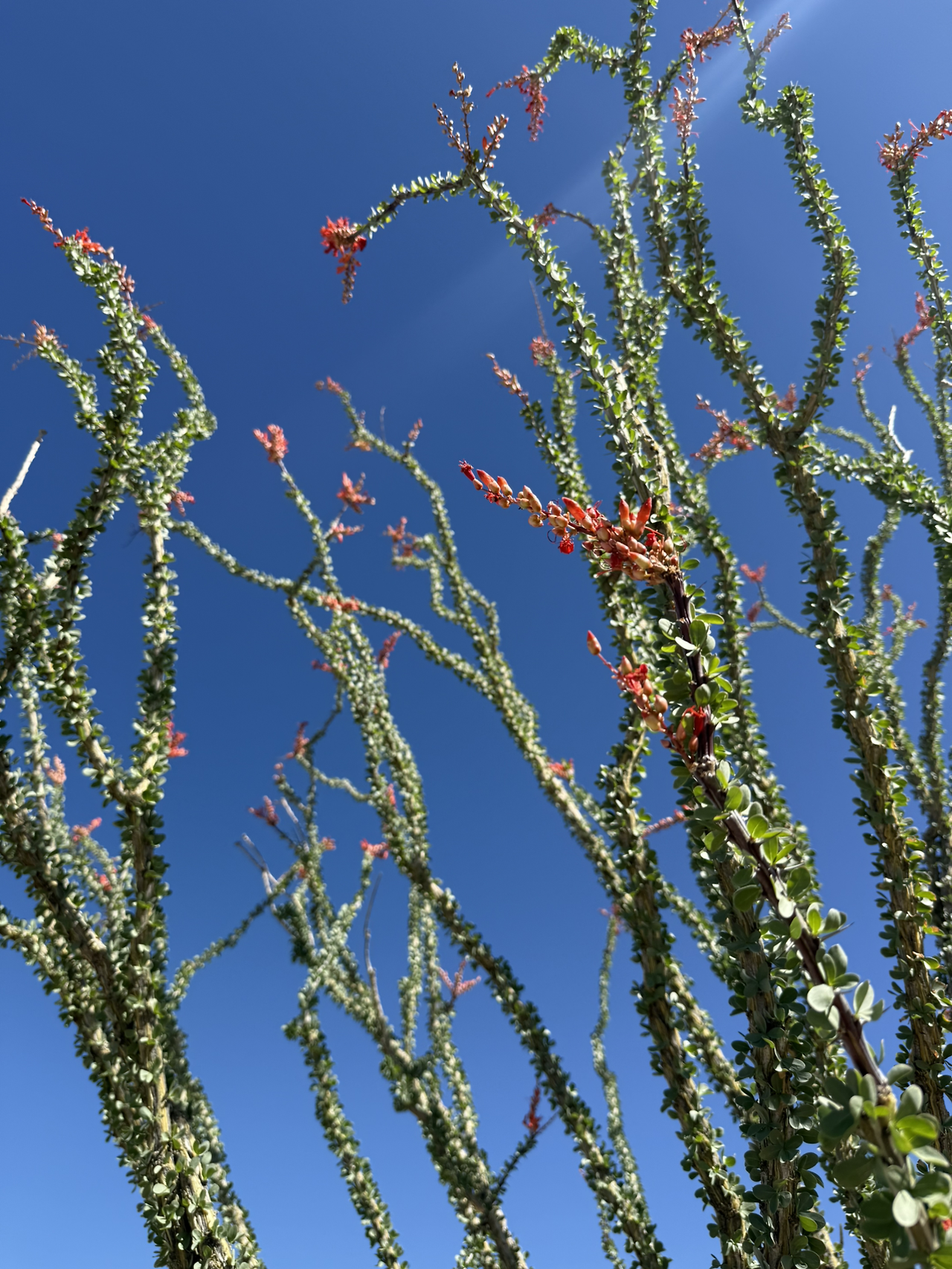사막에 왔다. 올 때마다 두통으로 혼쭐이 나지만 통증을 무력화하는 기쁨이 있다. 이번엔 오코티요(Ocotillo) 꽃을 처음으로 보았다. 초록색 기둥 끝에 생일축하합니다 불이 켜져있었다.