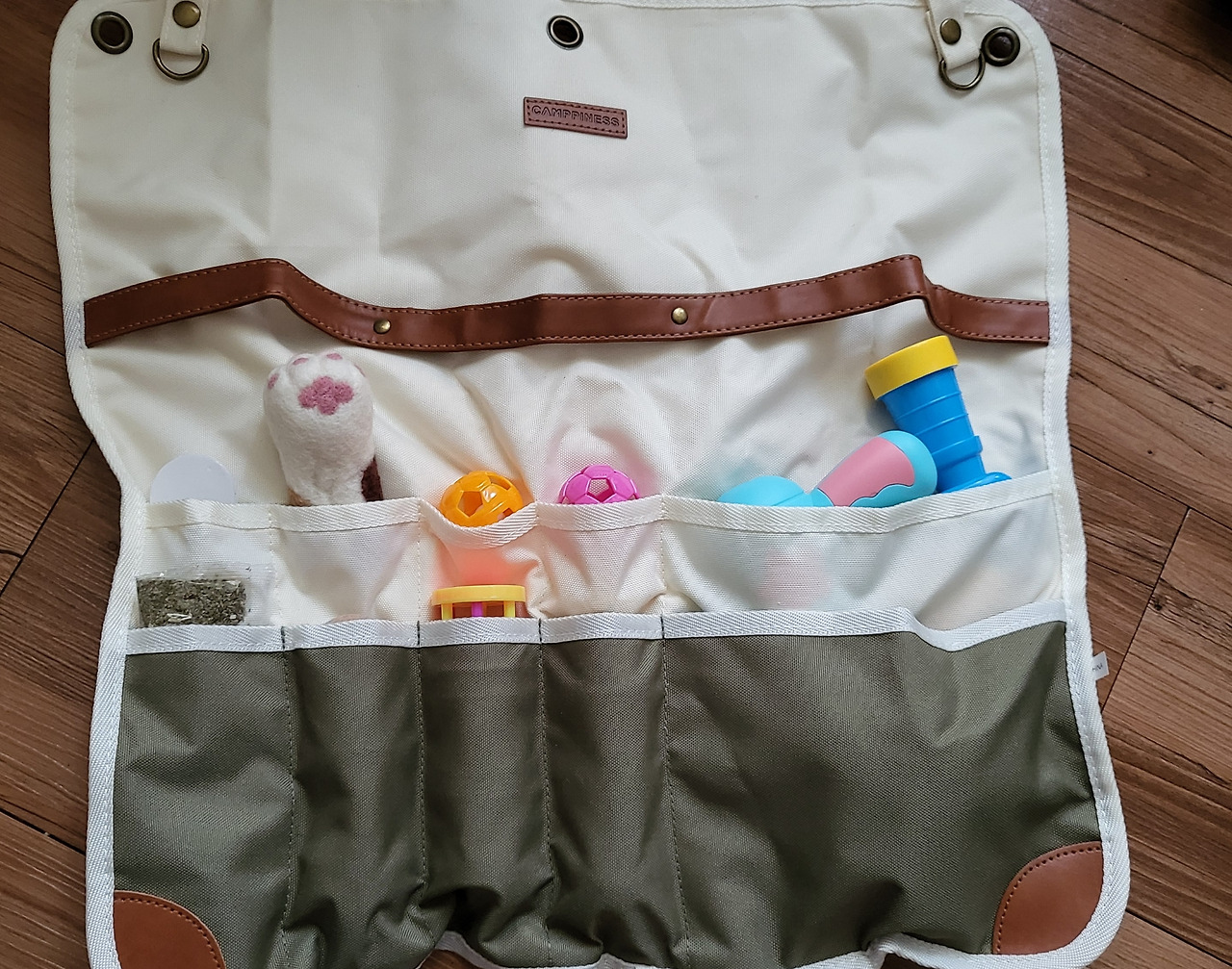첫 번째 제품은 장난감들을 수납하여 돌돌 말아 보관할 수 있는 정리대이다. 큰 주머니, 깊숙한 주머니가 있어 총이나 팽이 같은 큰 장난감을 보관하기에 좋다.