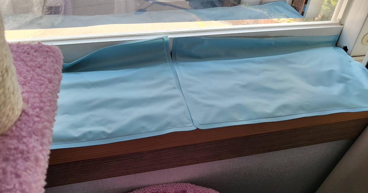 이 쿨매트의 좋은 점은 사이즈가 2가지인 것과, 중간에 이음새가 탄탄히 있어 필요하다면 위 사진처럼 잘라 쓸 수 있다는 것이다. 나는 창 밖을 구경할 아이가 덥지 않도록 쿨매트를 깔아놓았다.