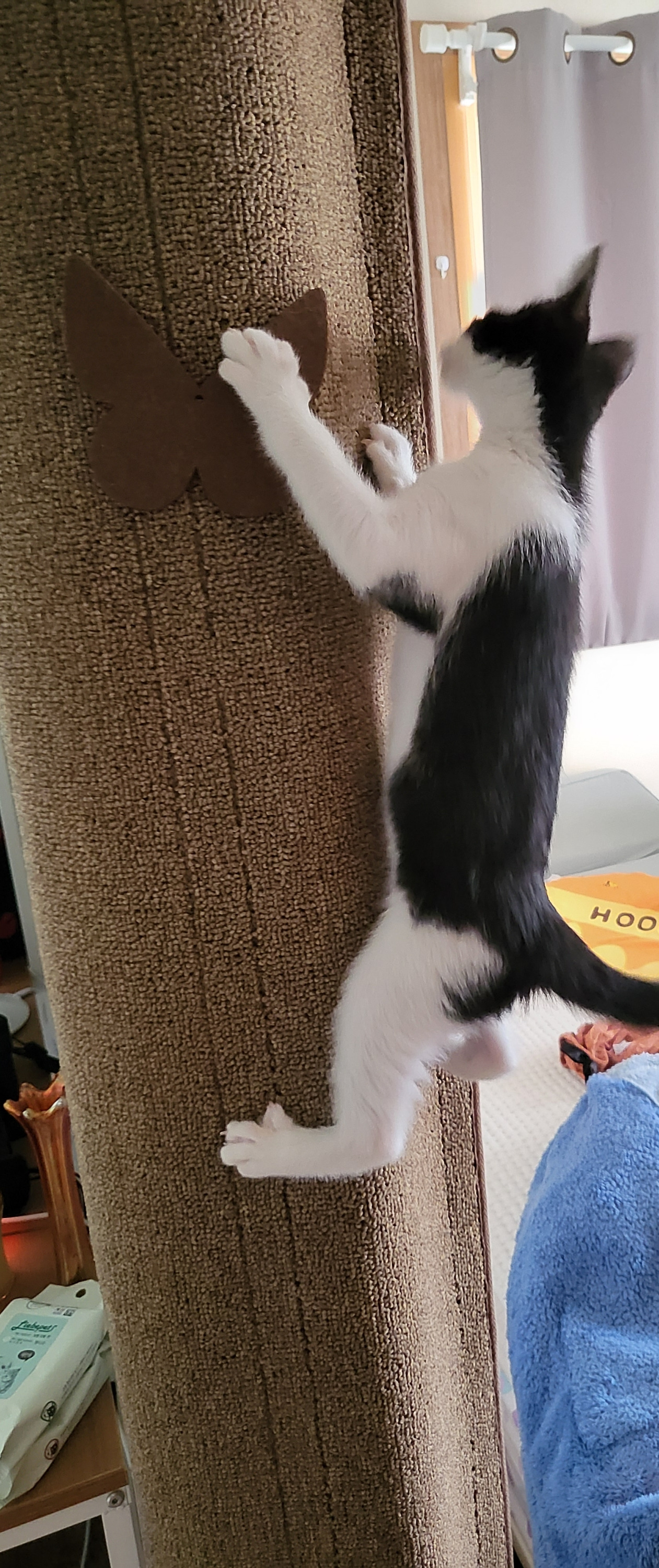 이 제품은 다이소 출처는 아니지만 이번에 구매해 보고 너무 혁명적이라 리뷰한다. '냥오름'이라는 유명한 수직 스크래쳐인데, 패브릭 소재로 되어 있어 깅깅이처럼 종이를 뜯어먹는 아이에게 줄 때 걱정할 필요가 없고 재질이 아주 탄탄하며 무려 2m나 된다. 일반적인 방문 틀에 꼭 맞아서, 틀을 따라 ㄱ자 혹은 ㄷ자로 붙여주면 이렇게 벽에 붙은 스파이더냥을 볼 수 있다.
