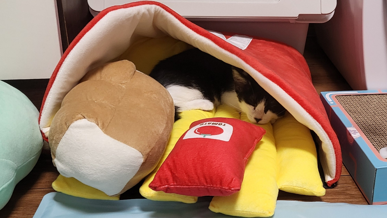 오늘은 이렇게 다이소 꿀템들을 리뷰해 보았다. 위 감자칩 봉지 쿠션은 온라인에서 구매하였는데 깅깅이가 드디어 숨숨집으로 써주기 시작해 기쁜 마음에 첨부한다.