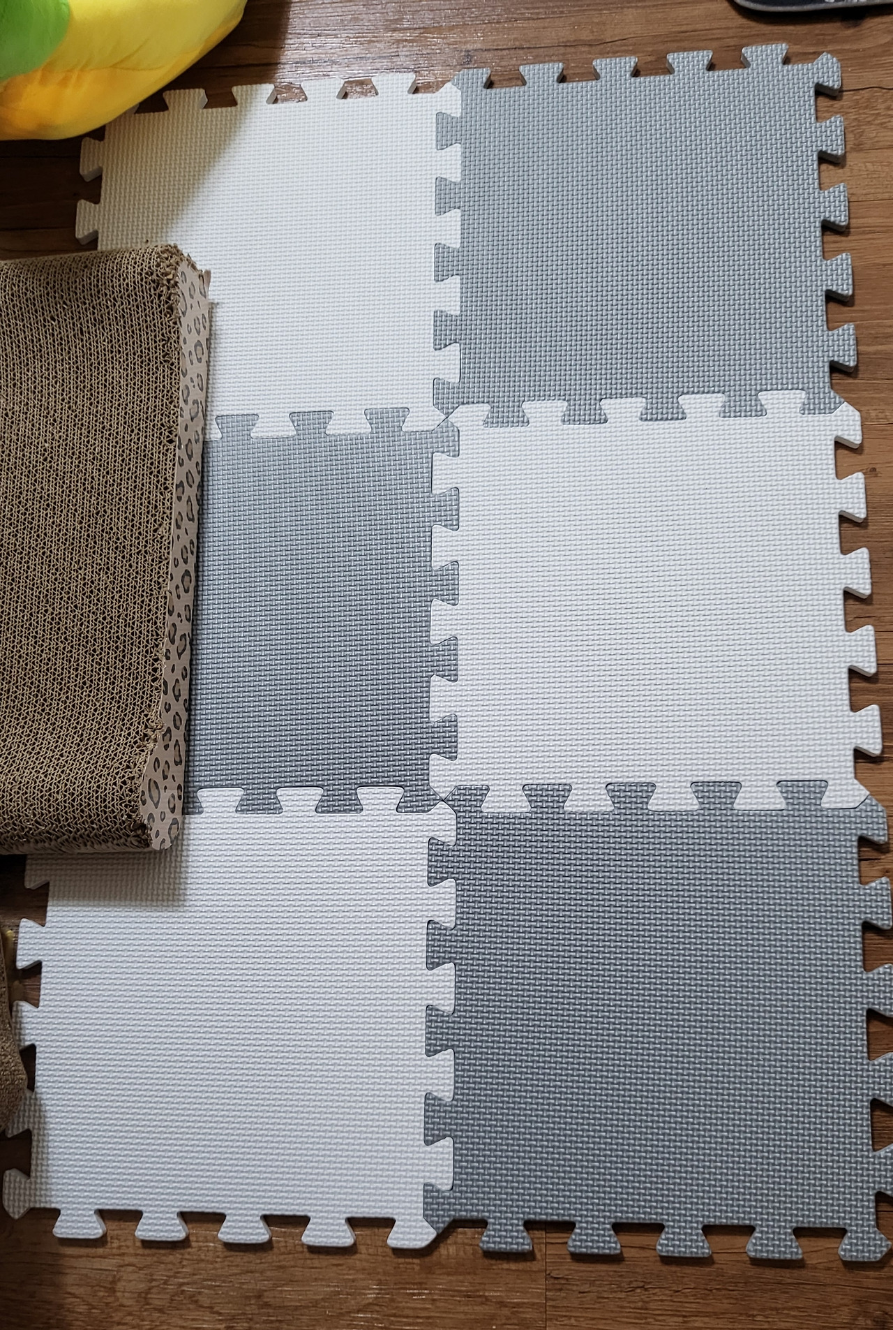 세 번째는 퍼즐매트이다. 원래는 어린이용인데, 냥오름을 구매하면서 아이가 위에서 펄쩍 뛰어내릴 때가 많아 혹시나 다칠까 봐 구매하였다. 5000원에 10피스로 충분한 공간을 채울 수 있다. 색감도 어릴 적의 촌스러운 빨강 노랑 알파벳 매트가 아니라 깔끔해서 인테리어에 잘 어울린다.