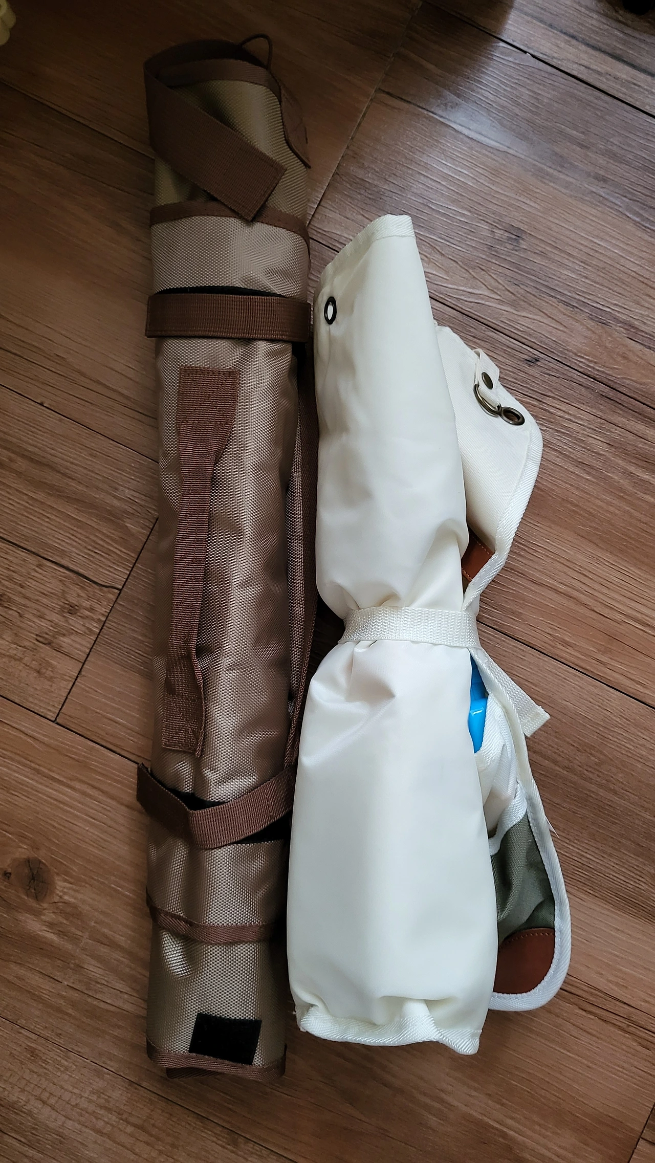 두 번째는 낚싯대를 하나하나 끼워 정리할 수 있는 혁명적 제품이다. 원래는 공구 등을 끼워 사용하는 건데, 아. 저 나란한 칸을 보라. 낚싯대를 너무나도 꽂고 싶지 않은가? 원래는 다른 캠핑용품 추천을 보고 다이소에 갔다가 득템한 제품이다. 한쪽에는 망사 주머니와 큰 밸크로가 있어 큰 제품 보관에도 용이하고, 앞의 제품과 마찬가지로 돌돌 말아 보관하면 된다.