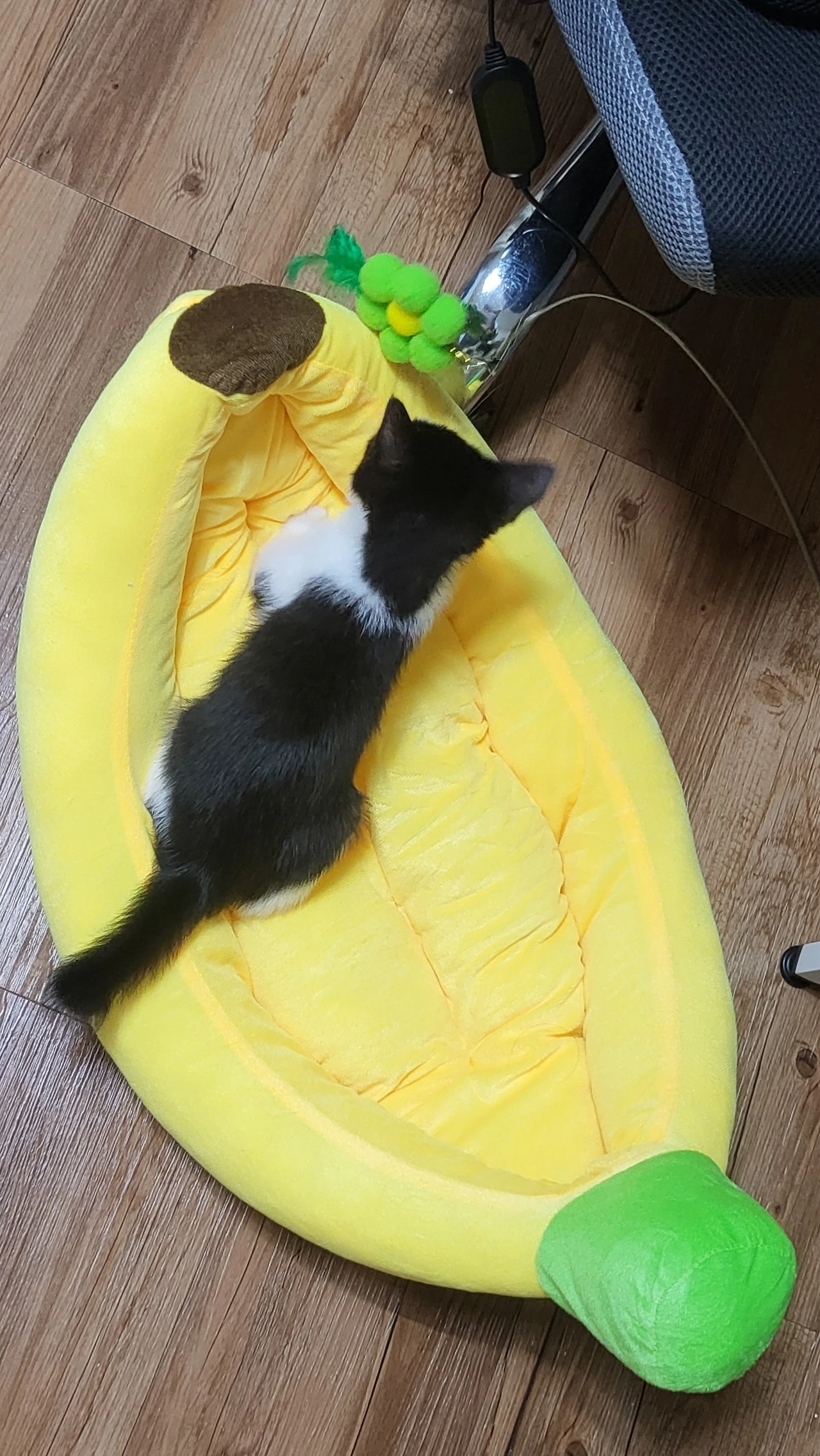 다이소에는 바나나 모양 방석도 파는데, 이것의 장점은 귀여움 뿐만 아니라 사냥놀이 할 때 옴폭 패인 바깥쪽에 낚싯대를 숨겨 아이의 흥미를 한껏 유발할 수 있다는 것이다.