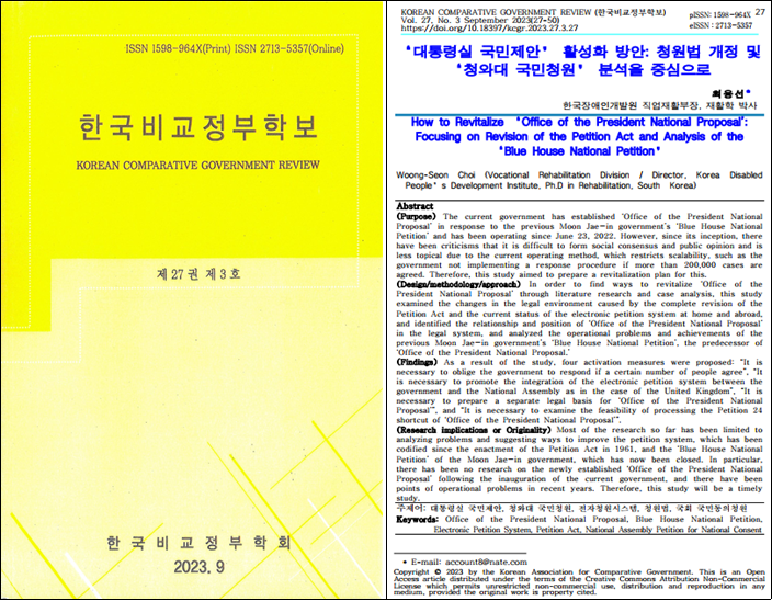 최웅선. 2023. “‘대통령실 국민제안’ 활성화 방안: 청원법 개정 및 ‘청와대 국민청원’ 분석을 중심으로” 『한국비교정부학보』 제27권 제3호. 한국비교정부학회. pp.27-50.