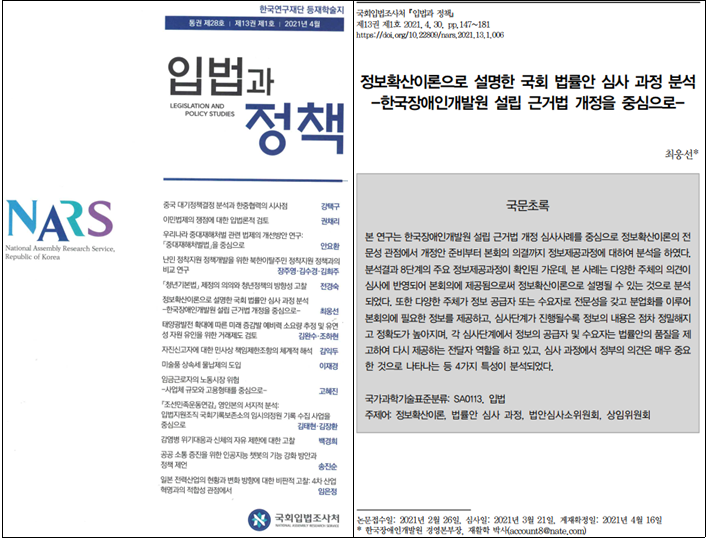 최웅선. 2021. “정보확산이론으로 설명한 국회 법률안 심사 과정 분석 - 한국장애인개발원 설립 근거법 개정을 중심으로 -” 『입법과 정책』 제13권 제1호. 국회입법조사처. pp.147-181.