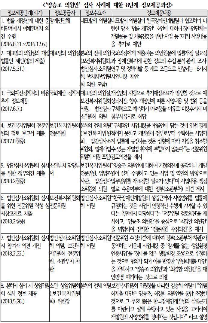 한편 ‘양승조 의원안’ 사례분석은 정보확산이론 관점에서 주된 흐름을 확인할 수 있으나, 앞서 살펴본 바와 같이 법률 개정안 준비단계의 장애인단체에 대한 이해관계자 의견 수렴 과정에서 각 단체의 이해관계에 따라 설립목적과 사업내용을 조정한 점을 볼 때