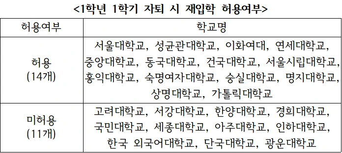 특히 고려, 서강, 한양, 경희, 국민, 세종, 아주, 인하, 한국 외국어, 단국 및 광운대학교의 경우 1학년 1학기에 자퇴한 자에 대하여는 재입학 신청 자체를 제한하고 있어 유의해야 한다.