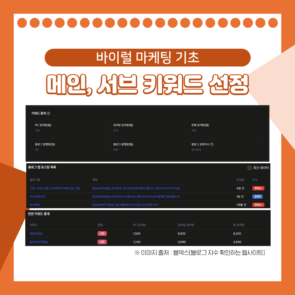 두 번째로, 위에 언급해드렸던 "블덱스"라는 사이트에서 내가 앞으로 광고할 메인 키워드와 서브 키워드를 선정하는 것입니다. 만약에 미용실을 창업해서 바이럴 마케팅 광고를 시작하셨다고 가정해보겠습니다.