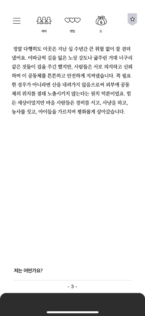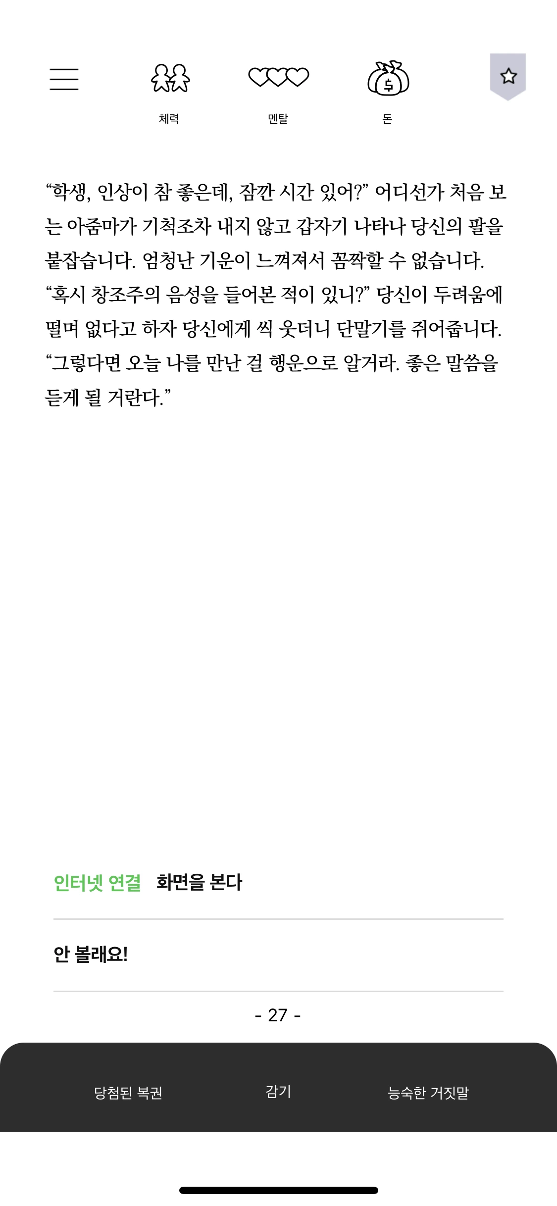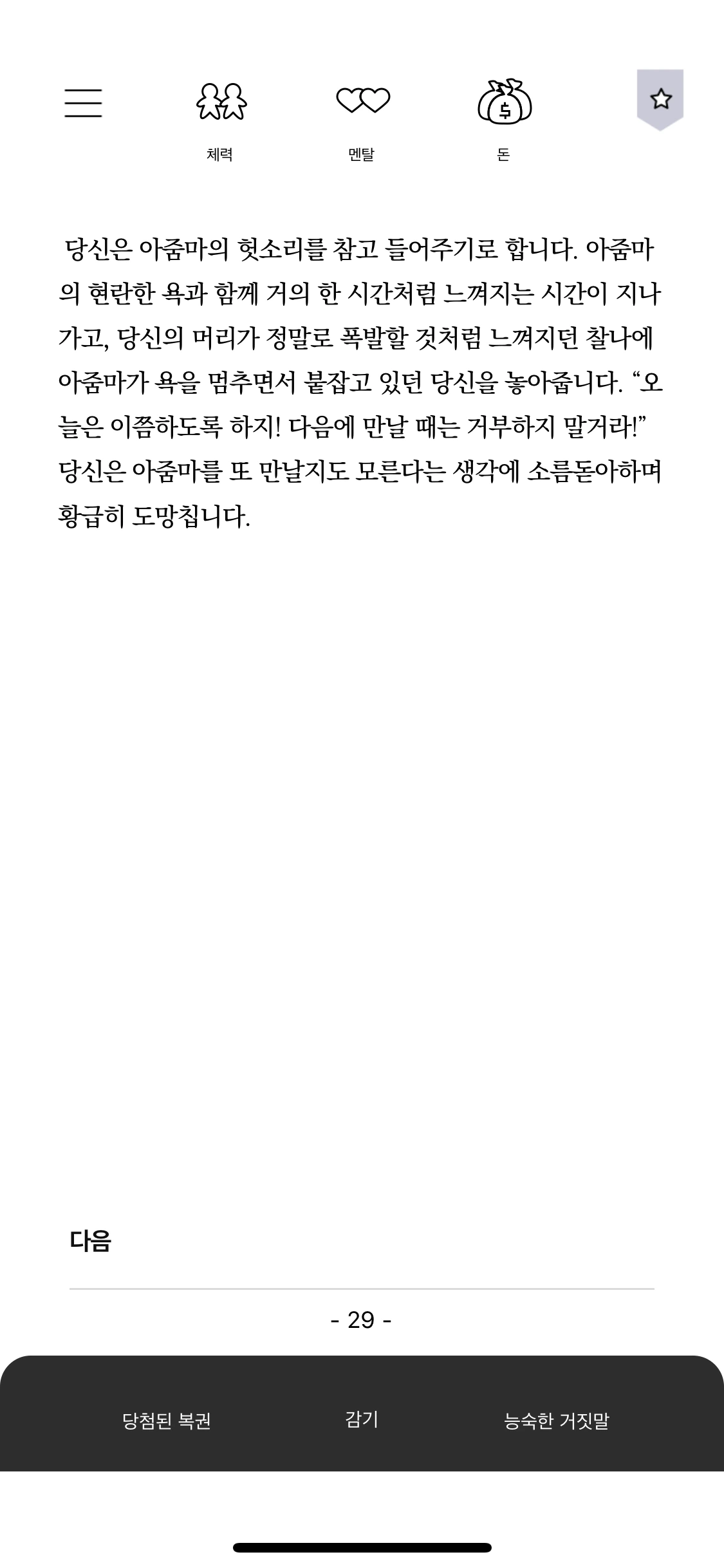 서울 2033 무료 버전은 유료로 구입한 후원자 버전보다는 업데이트가 느립니다. 제가 유료버전을 설치한 이유는 업데이트를 정기적으로 받아 더 다양한 스토리를 즐기기 위해서도 있지만, 자꾸 나오는 광고 때문인 게 가장 큰데요... 광고가 어떻게 나오냐면, '지금 당장 이 광고를 보지 않으면, 네가 애지중지 키운 이 캐릭터의 체력과 멘탈의 씨를 말려서 바로 죽게 만들 거야!' 식입니다. 처음엔 참신했는데 점점 갈수록 화가...