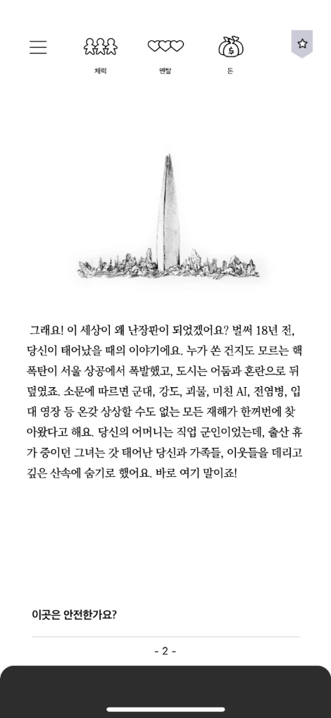 제가 요즘 푹 빠져 새벽까지 하다 결국 유료인 후원자 버전까지 지르게 한 모바일 게임, '서울 2033'의 스토리 도입부입니다. '서울 2033'의 영업 글을 쓰기로 마음먹은 이유는, 텍스트 게임인데도 불구하고 몰입감 넘치는 화법과, 짜인 스토리가 생각보다 간단치 않아 선데요.