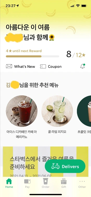 앞서 보셨듯이 메인에서는 '아름다운 이 여름 000님과 함께'라는 Greeting message가 눈에 띄죠. 이전 버전과는 조금은 다른 톤의 감성적인 writing입니다. 사실 이 UX writing이 제일 잘 부각되는 부분은 사이렌오더로 주문 직후 나오는 화면인데요. 그걸 제가 캡쳐를 못해서 사진을 첨부를 못하고 있네요. (아시는 분들은 아시리라 믿으며...) 조만간 내용 보충하러 다시 오겠습니다 ㅠ