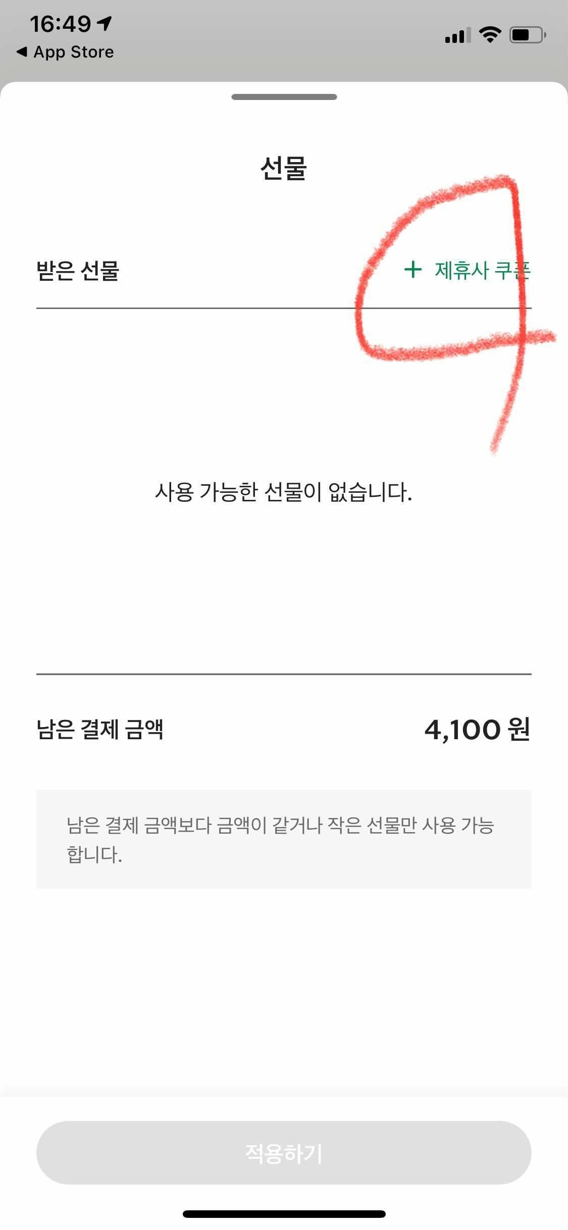 내부적으로 사이렌오더 + 카드 시스템을 사용하기 때문에 미리 등록이 불가능한 사연이라도 있는걸까요?... 앱이 리뉴얼 됐는데도 이 부분은 리뉴얼 전처럼 비슷한 UX로 진행되더라구요. 결제 직전 선물 - 제휴사 쿠폰 - 이미지 불러오기 or 바코드 촬영 or 바코드 번호 입력하기 루트를 타야만 합니다. 이 부분은 스타벅스 코리아만의 큰 그림이 있는 것인지, 아니면 어쩔 수 없는 선택이었는지 궁금해집니다.