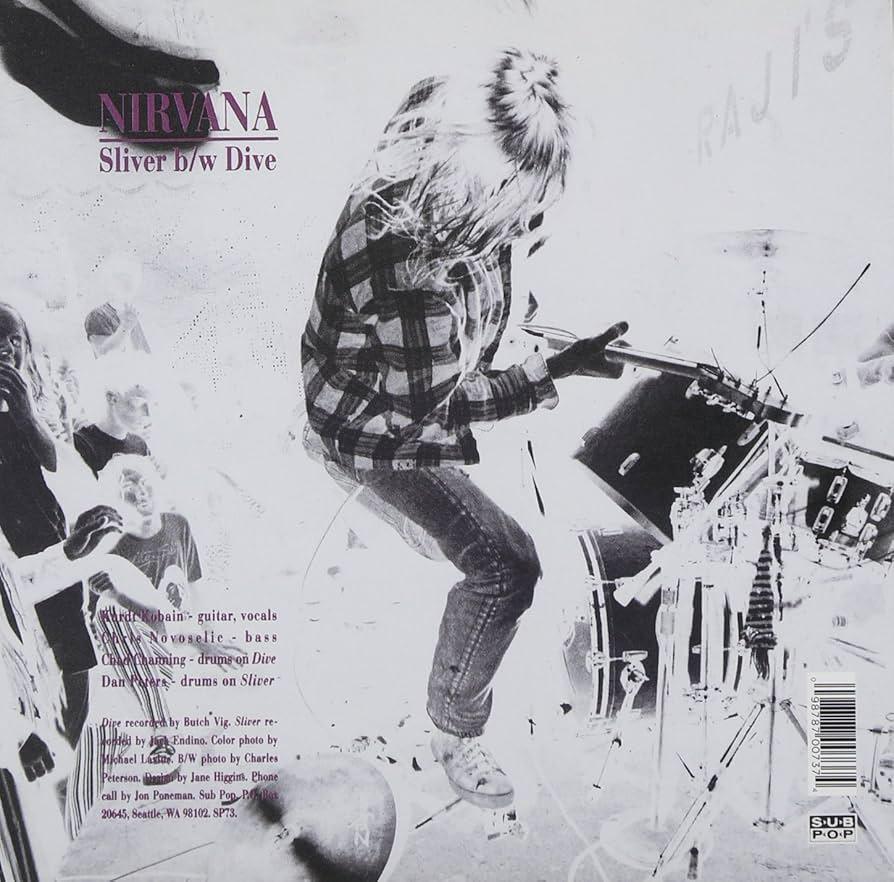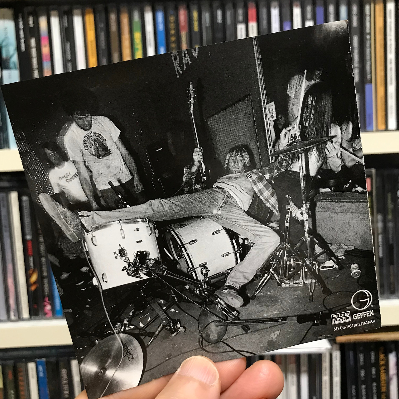 커트가 채드의 드럼킷에 널브러진 모습을 담은 《Bleach》 북릿 뒤표지는 싱글 <Sliver> 뒤표지(오른쪽) 것과 같은 공연에서 찍었다. 모두 찰스 피터슨의 솜씨다.